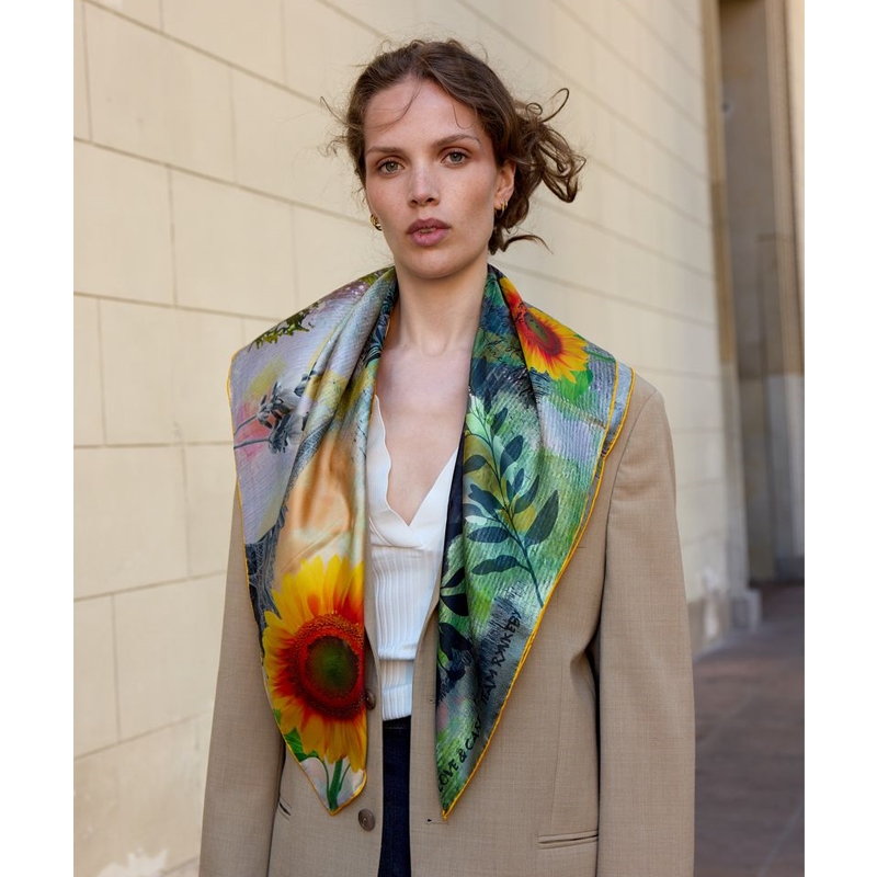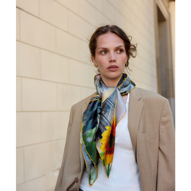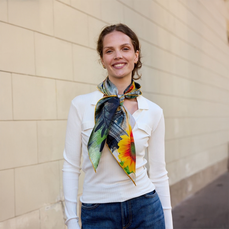Tørklædet kombinerer et moderne fashion print med elementer inspireret af cykelturen til Paris og de to organisationer, som Team Rynkeby støtter i Danmark: Børnelungefonden og Børnecancerfonden. Det er udelukkende disse to organisationer, der modtager støtte fra salget af tørklæderne.